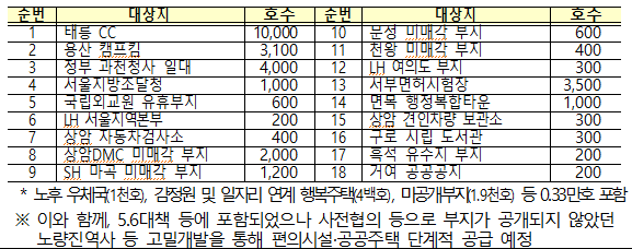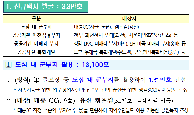 첫째, (i) 군 시설, (ii) 국유지공공기관 부지, (iii) 서울시 유휴부지 등을 최대한 활용하여 우수입지 내 택지를 확보합니다.