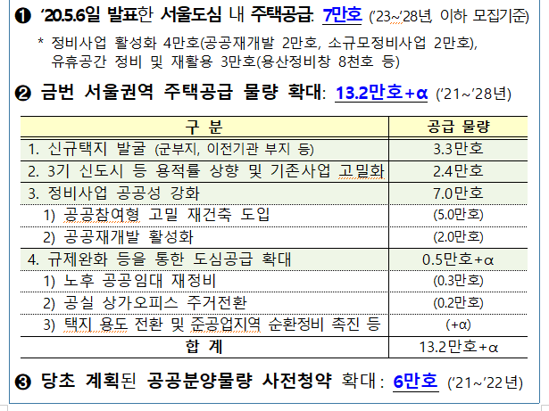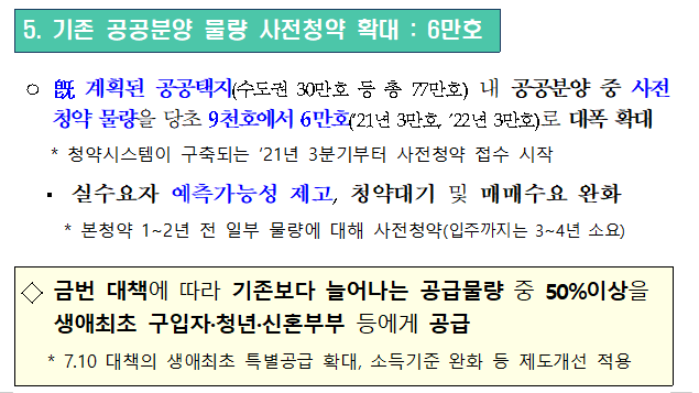 3. 나머지 6만호(수도권 30만호 등 총 77만호중)는 예정된 공공분양물량 중 21~22년으로 앞당긴 사전청약 확대분입니다.