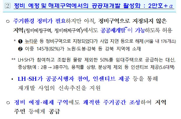 ④ 재개발 정비구역 외에 정비예정 및 정비해제구역에서도 공공재개발을 활성화하여 2만호 이상의 주택을 공급하도록 하겠습니다. 정비예정구역에서는 공공재개발을 조기 추진할 수 있도록 하고, 정비해제구역 중 뉴타운 등과 같이