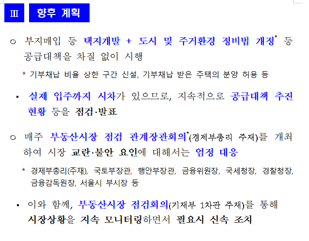 정부는 공급대책 발표후 매주 부총리 주재 ‘부동산시장점검 관계장관회의를 개최하여 주택 수요대책/공급대책 이행상황을 면밀히 점검할 계획입니다.