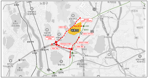 ※ 광역교통개선대책 : 경춘선 열차 추가 투입, 화랑로 확장 및 화랑대사거리 입체화, 태릉 BRT 신설 등 그 외 용산 미군 반환부지 중 캠프킴 부지도 주거공간으로 조성하여 3,100호를 공급할 예정입니다.