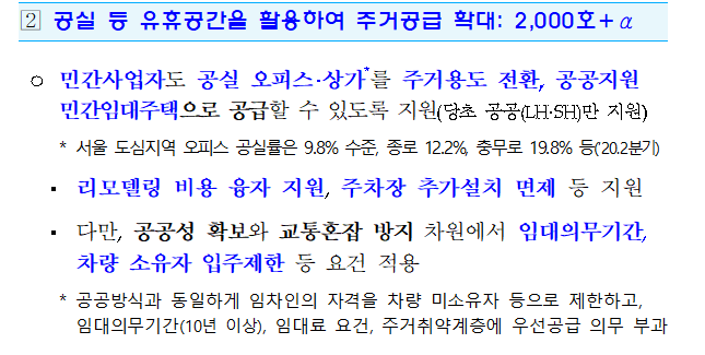 아울러 이제까지 공공사업자(LH·SH)만이 가능했던 공실 오피스와 상가 매입후 주거용도로 전환공급하는 제도를 민간사업자에게도 허용(2천호 목표)합니다.
