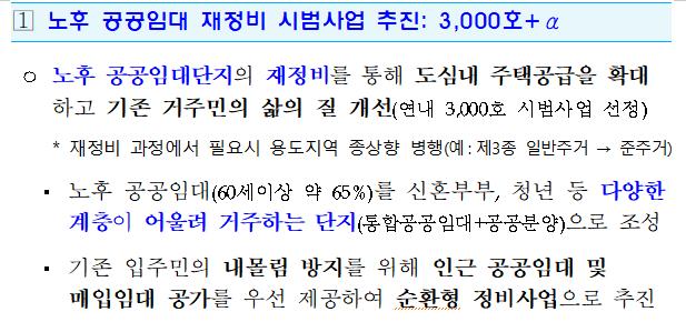 먼저 노후 영구임대단지의 재건축을 통해 3천호를 추가 확보하여 다양한 계층이 어울리는 단지를 조성하는 한편, 기존 거주민들의 삶의 질도 개선할 계획입니다.