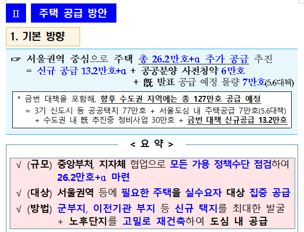 서울권역을 중심으로 총 26만호+α 수준의 대규모 주택공급이 집중 추진됩니다. 이는 크게 3부분으로 구성되어 있습니다.