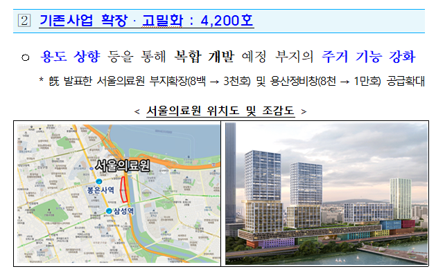 ② 서울의료원용산정비창 등 복합개발이 예정된 사업부지에 대해서도 고밀화를 통해 4천호의 주택을 추가 공급 계획입니다.
