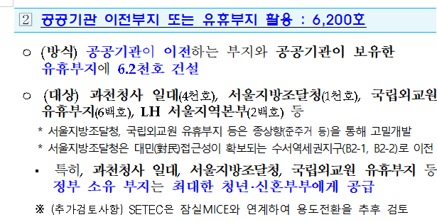 특히, 서울지방조달청(1천호) 등 국가시설의 이전으로 확보되는 국유지와, 정부과천청사(4천호)·국립외교원(600호) 유휴부지에 공급되는 주택은 최대한 청년신혼부부에게 공급할 계획입니다.