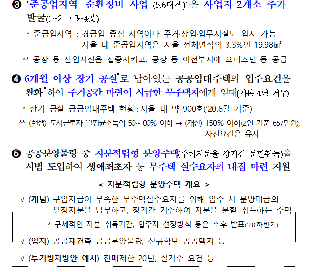 이외 서울 준공업지역(경공업 지역이나 주거상업도 입지 가능) 순환정비사업지도 연내 3~4곳으로 확대 정비하는 등 다양한 규제완화*를 통해 민간 공급능력을 추가로 확충해 나갈 계획입니다.