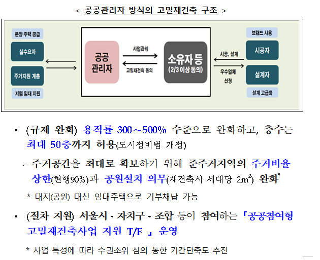 ① LH·SH 등 공공참여 時 도시규제 완화를 통해 주택을 획기적으로 공급하는 ‘고밀 재건축을 도입하겠습니다. 용적률 상향조정 및 층수제한 완화 즉 용적률을 300∼500% 수준으로 완화하고, 층수도 50층까지 허용하는 고밀 재건축을 통해 향후 5만호 이상의 추가 공급을 확보할 계획입니다.